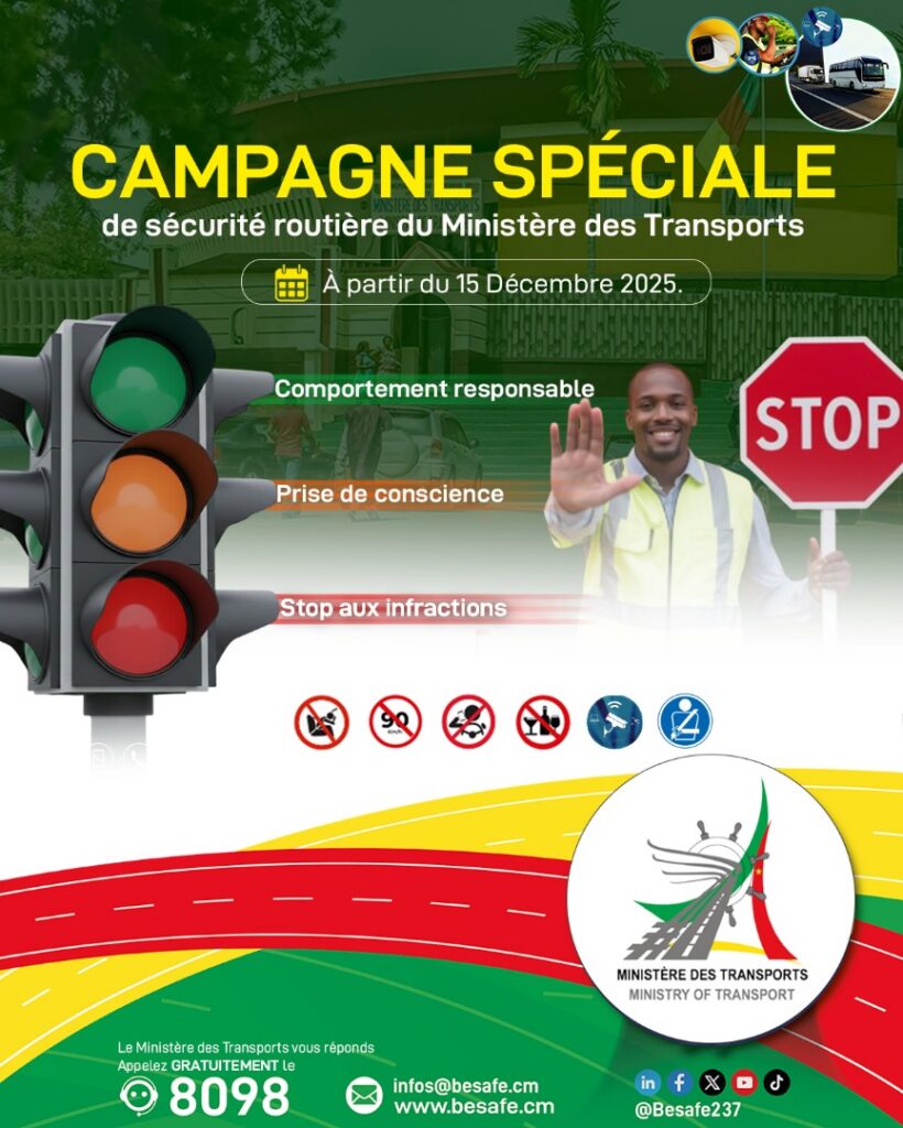 Le Ministre des Transports, Jean Ernest Masséna Ngalle Bibehe, appelle chaque usager à la responsabilité, à la vigilance et au respect strict du Code de la route. Parce qu’une seconde d’inattention peut coûter une vie, engageons-nous tous pour des fêtes sans drames sur nos routes.