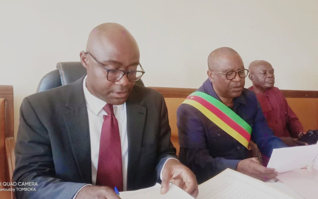 Dès son arrivée au somptueux hôtel de ville, Steve Pierre BIDOUNG KPWATT*, représentant du Préfet du Département du Haut-Nyong, a été chaleureusement accueilli par le Maire. Cette réunion a commencé par un moment de recueillement en mémoire de deux conseillers municipaux disparus récemment, preuve de l’attachement de la commune à ses serviteurs publics.