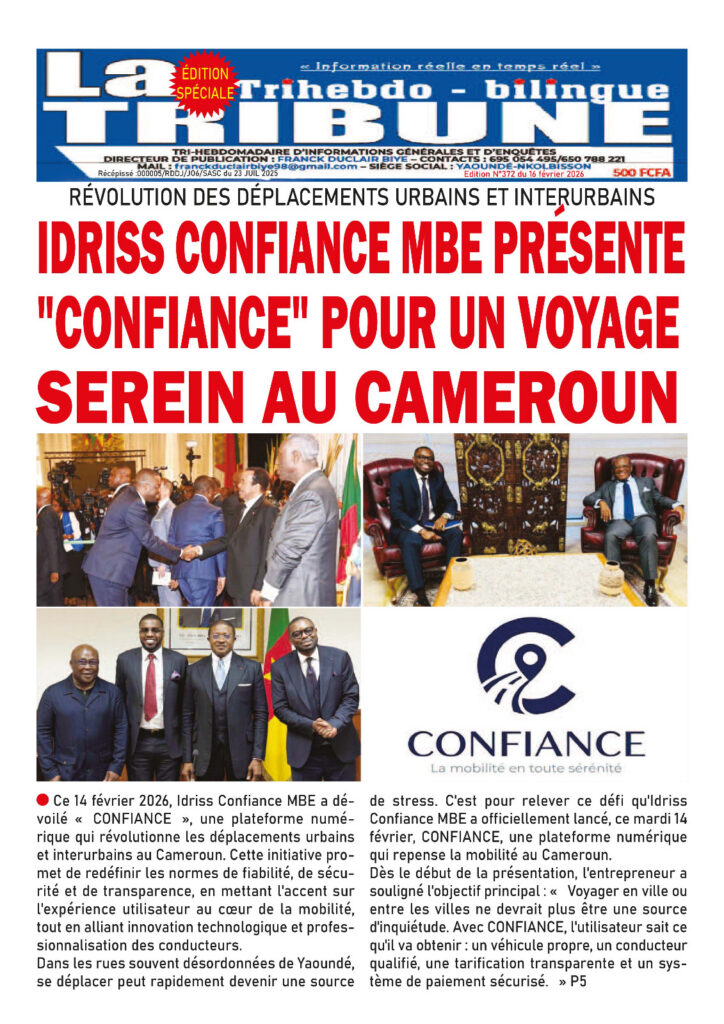Ce 14 février 2026, Idriss Confiance MBE a dévoilé « CONFIANCE », une plateforme numérique qui révolutionne les déplacements urbains et interurbains au Cameroun. Cette initiative promet de redéfinir les normes de fiabilité, de sécurité et de transparence, en mettant l’accent sur l’expérience utilisateur au cœur de la mobilité, tout en alliant innovation technologique et professionnalisation des conducteurs.