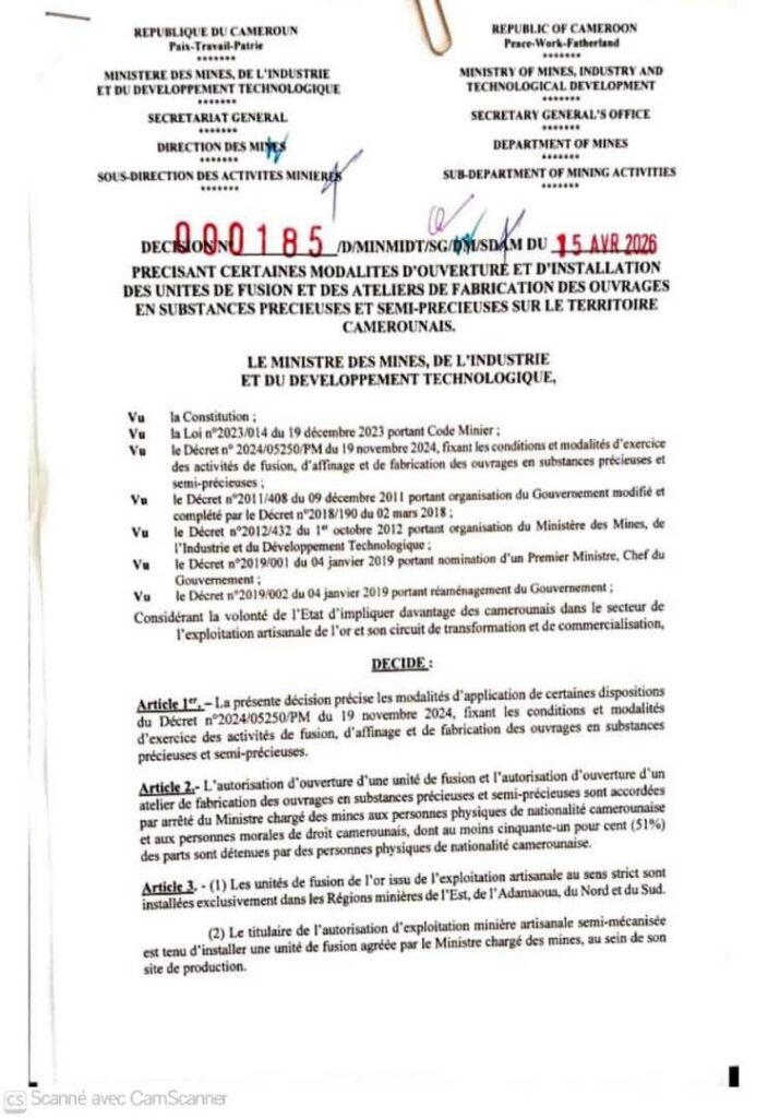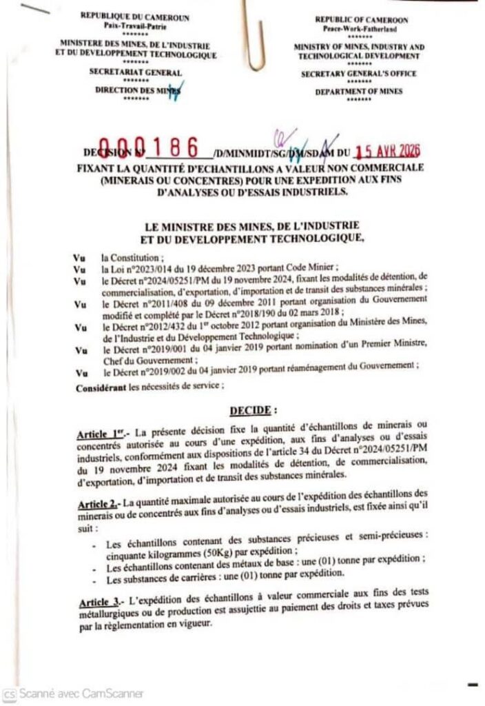Par une double offensive réglementaire signée ce 15 avril 2026, le Ministre par intérim des Mines, de l’Industrie et du Développement Technologique (MINMIDT) met fin à l’opacité des exportations d’échantillons et encadre désormais strictement la création d’unités de transformation des métaux précieux.